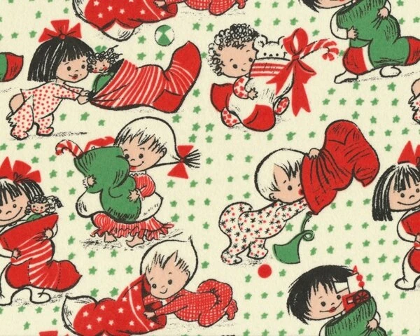 Design: Babies und Kleinkinder mit Geschenken in Weihnachtssocken (maximal 12 cm Breite) auf Sternen-Grund