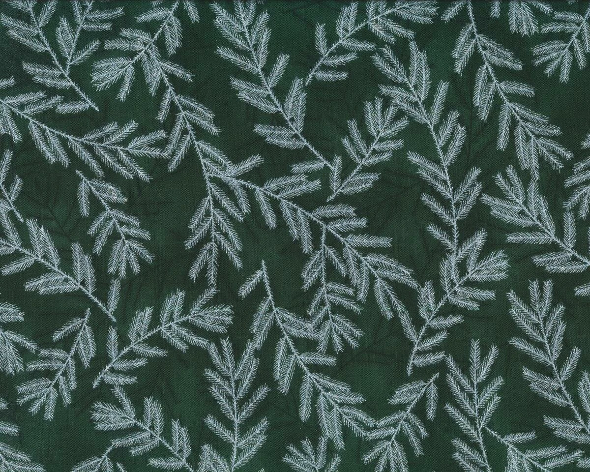 Patchworkstoff mit Metallicverzierung A CARDINAL CHRISTMAS mit Tannenzweigen in grün von Hoffman Fabrics