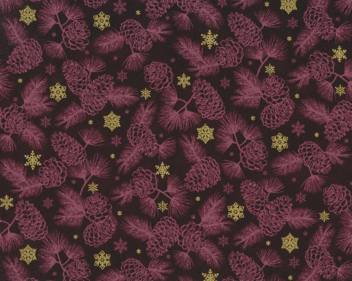 Metallic-Baumwollstoff in aubergine mit Zapfen und Sternen in Gold-Print