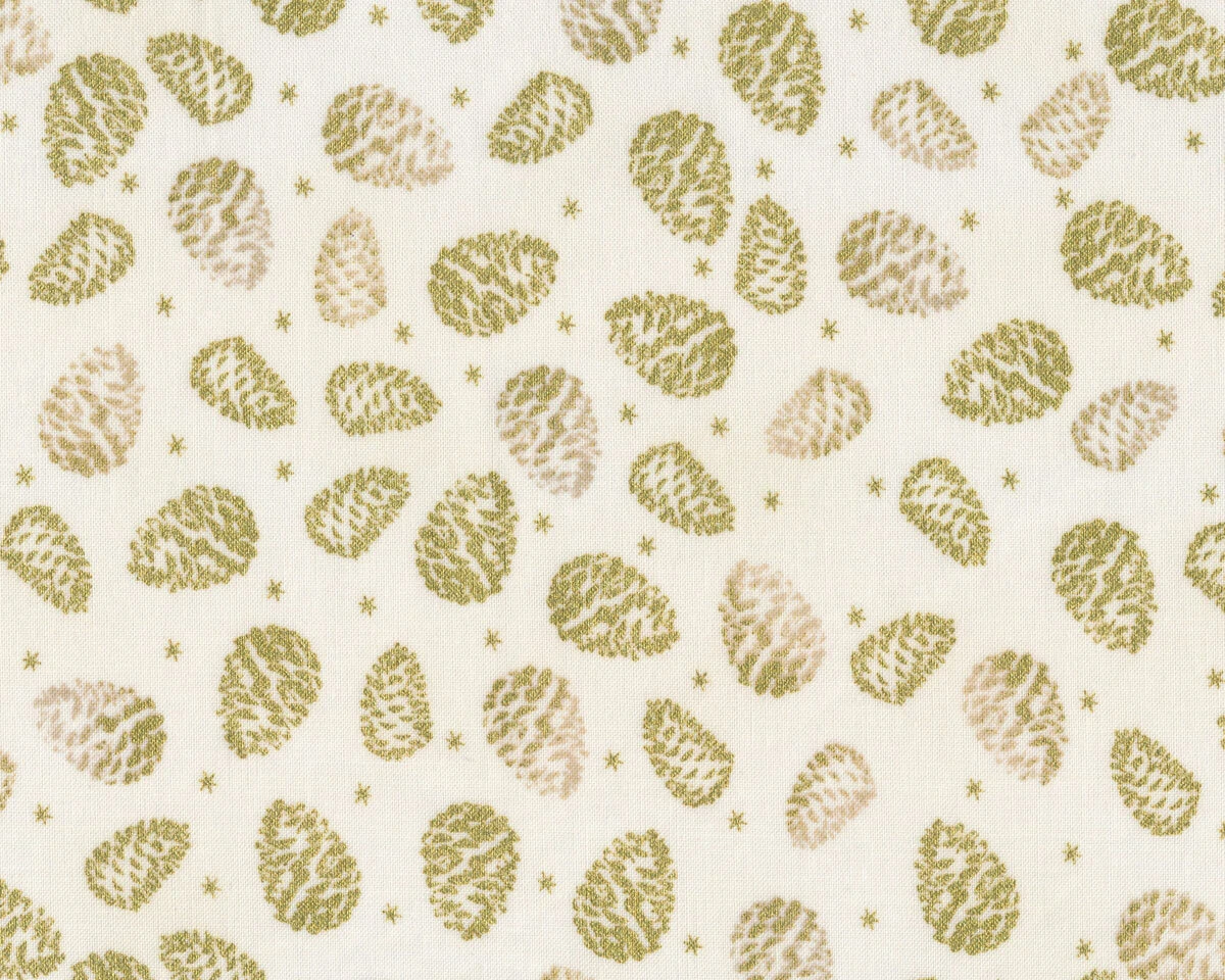 Metallic-Baumwollstoff in creme mit Tannenzapfen in Gold-Print