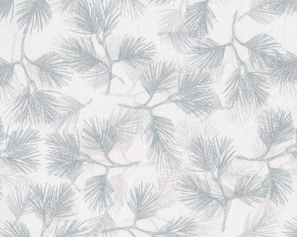 Metallic-Baumwollstoff in weiß mit Tannenzweigen in Silber-Print