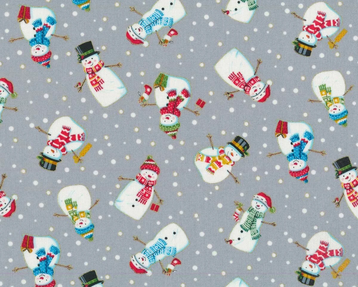 Der Patchworkstoff mit Schneemännern in verschiedenen Gewändern in grau gehört zur MERRY CHRISTMAS-Kollektion von Makower UK für Hilco.