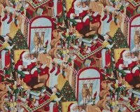 großformatiges, versetzt angeordnetes Motiv vom Weihnachtsmann im Lehnstuhl (ca. 25 cm hoch) mit seinen Wichteln, Rentieren, Geschenkebergen und Weihnachtspost