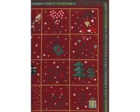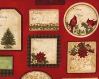 60-cm-Rapport Patchworkstoff HOLLY JOLLY CHRISTMAS Mit Weihnachts-Etiketten, Dunkelrot
